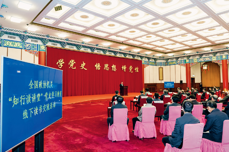 全国政协机关注重把开展党史学习教育与政协读书活动有机融合,依托委员移动履职平台网上“全国政协书院”开展读书交流活动,建立了“中共党史学习”等12个主题读书群,形成了线上线下相结合、读书履职相促进的读书学史格局,推动党史学习教育走深走实、入脑入心。图为2021年4月20日,全国政协机关在北京举办以“学党史、悟思想、增党性”为主题的党史学习教育线下读书交流活动。 全国政协办公厅新闻局 王达/摄