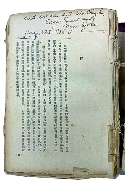 复社版《西行漫记》序言页,上有埃德加·斯诺签名 上海市历史博物馆(上海革命历史博物馆)供图