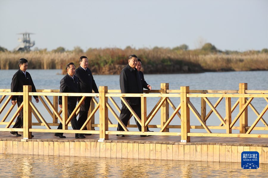 10月22日下午,中共中央总书记、国家主席、中央军委主席习近平在山东省济南市主持召开深入推动黄河流域生态保护和高质量发展座谈会并发表重要讲话。这是座谈会前,习近平20日下午在东营市黄河三角洲国家级自然保护区察看黄河三角洲湿地生态环境。 新华社记者 王晔 摄