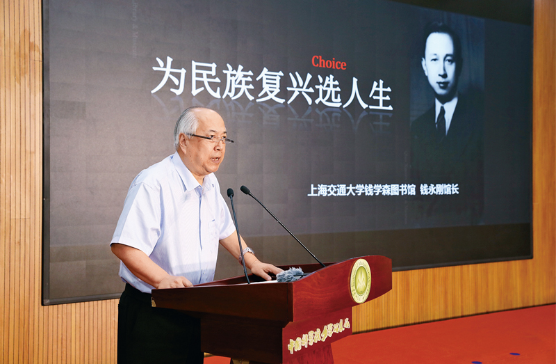 2021年7月15日,中国科学院在该院力学研究所为首个弘扬科学家精神示范基地授牌,并为以钱学森、赵九章、施雅风等老科学家命名的首批三支科技攻关突击队授旗。图为活动现场,钱学森之子钱永刚讲述钱学森的五次人生选择。 新华社记者 金立旺/摄