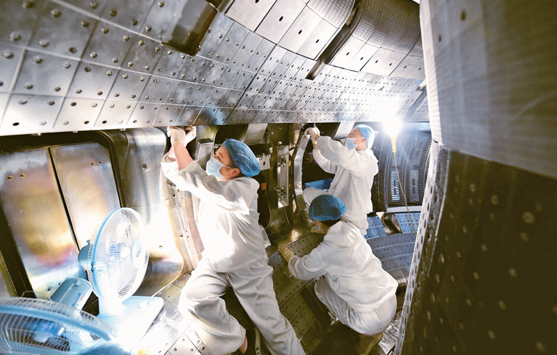 2021年5月28日,中国科学院合肥物质科学研究院有“人造太阳”之称的全超导托卡马克核聚变实验装置(EAST)创造新的世界纪录,成功实现可重复的1.2亿摄氏度101秒和1.6亿摄氏度20秒等离子体运行,向核聚变能源应用迈出重要一步。图为工作人员对全超导托卡马克核聚变实验装置(EAST)进行升级改造。 新华社记者 周牧/摄