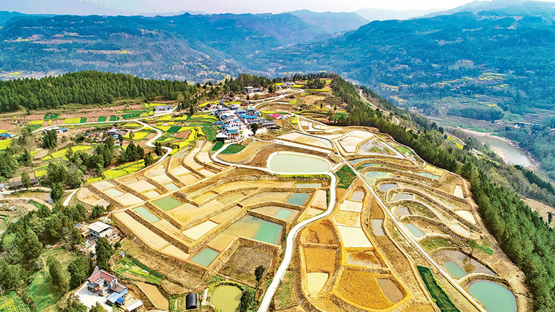 耕地是粮食生产的命根子,必须确保18亿亩耕地实至名归。近年来,四川省巴中市通江县在山区将零散、异形、坡度较大的土地进行宜机化改造,让“零碎地”变标准田、闲置土地变良田。图为2022年3月14日,通江县铁佛镇中岭村宜机化改造后的土地,进行了玉米大豆带状复合种植的田园景色。 求是图片 程聪/摄