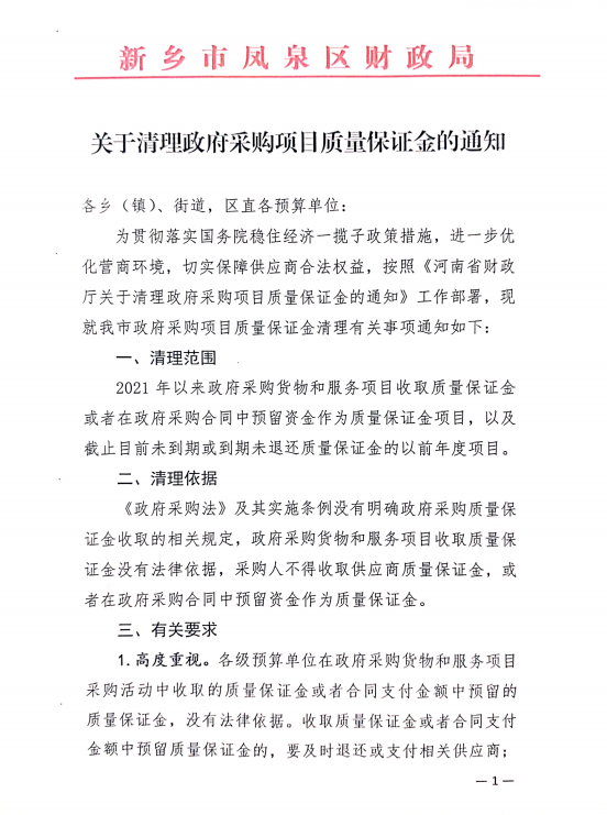 凤泉区财政局关于清理政府采购项目质量保证金的通知