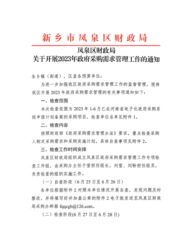 凤泉区财政局关于开展2023年第二季度政府采购监督检查工作的通知