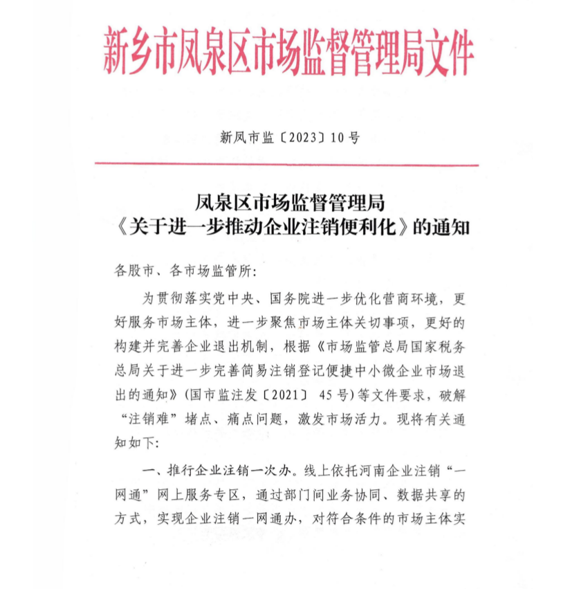 凤泉区市场监督管理局《关于进一步推动企业注销便利化》的通知