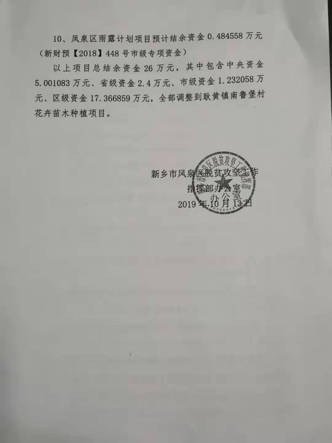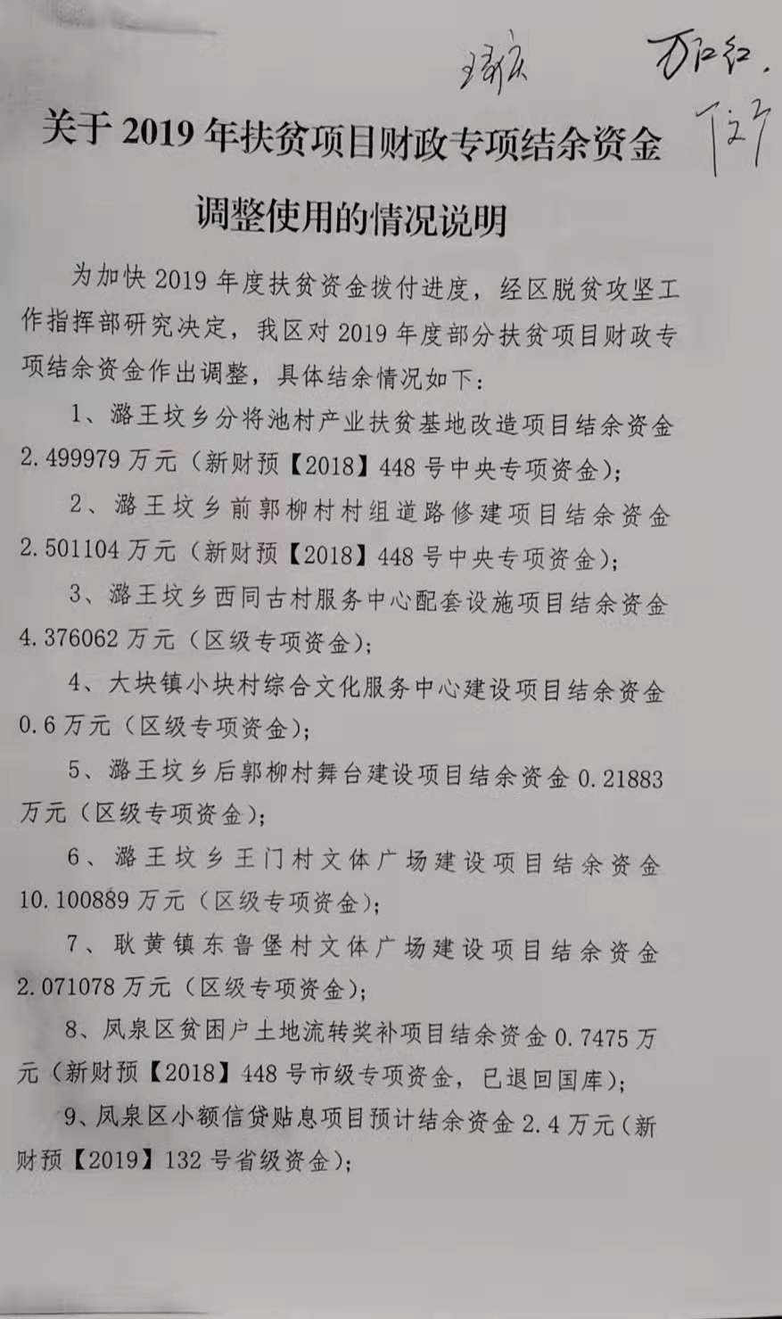 依据凤泉区脱贫攻坚工作指挥部“关于2019年扶贫项目财政专项结余资金调整使用的情况说明”,对2019年我区部分扶贫项目资金投资规模予以调整。