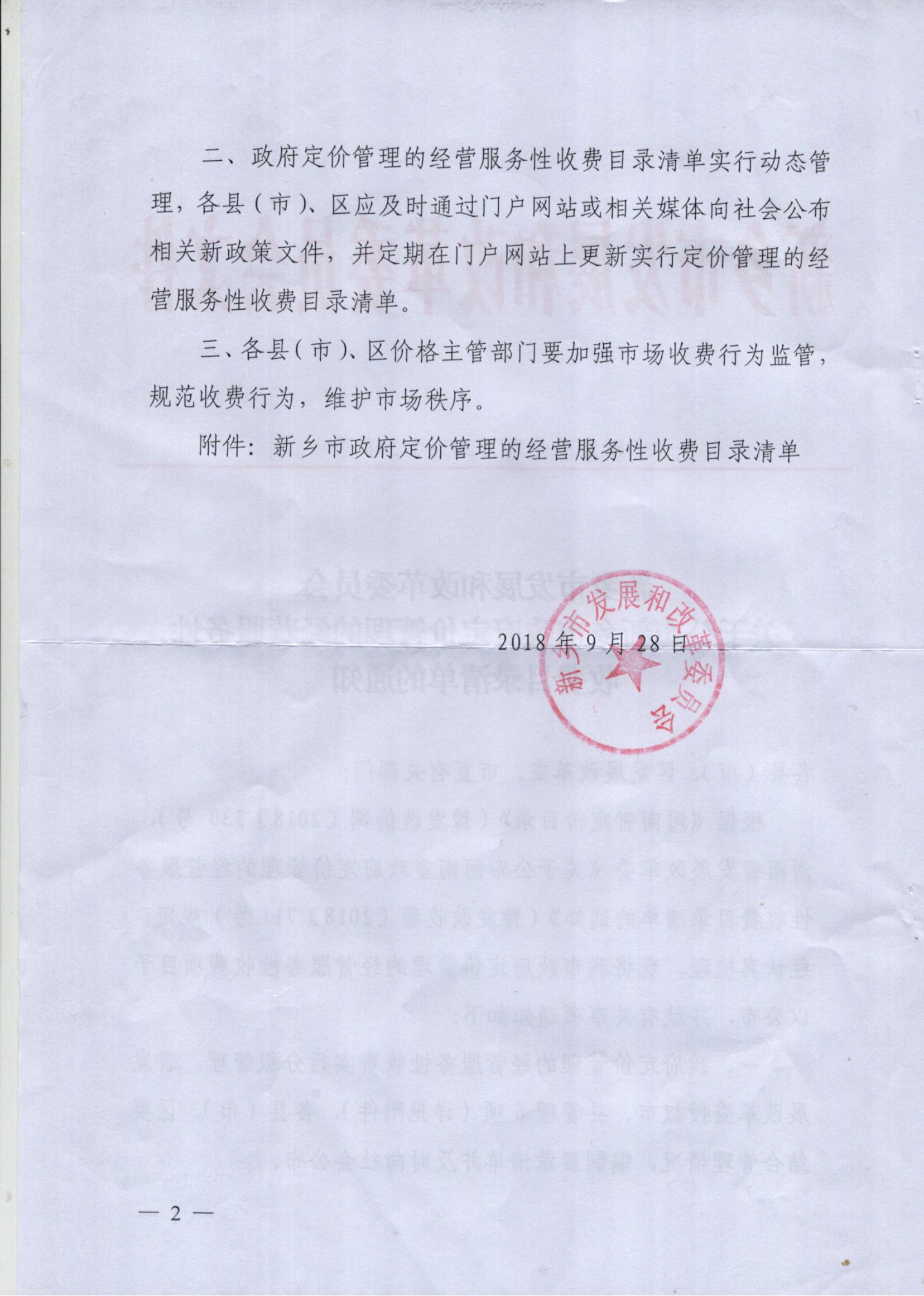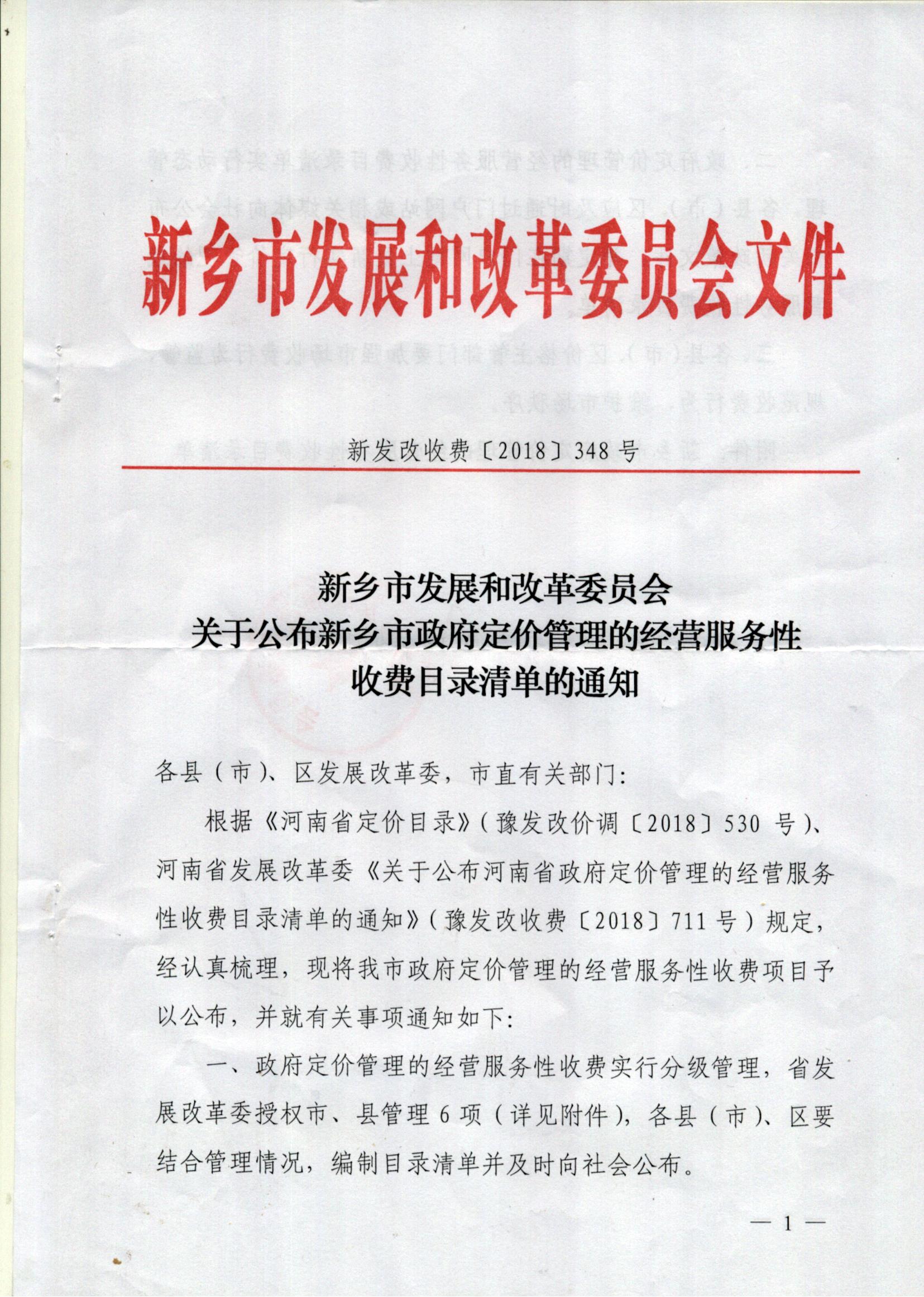 现将市发展改革委《关于公布新乡市政府定价管理的经营服务性收费目录清单的通知》(新发改收费〔2018〕348号)转发给你们,请认真贯彻执行。