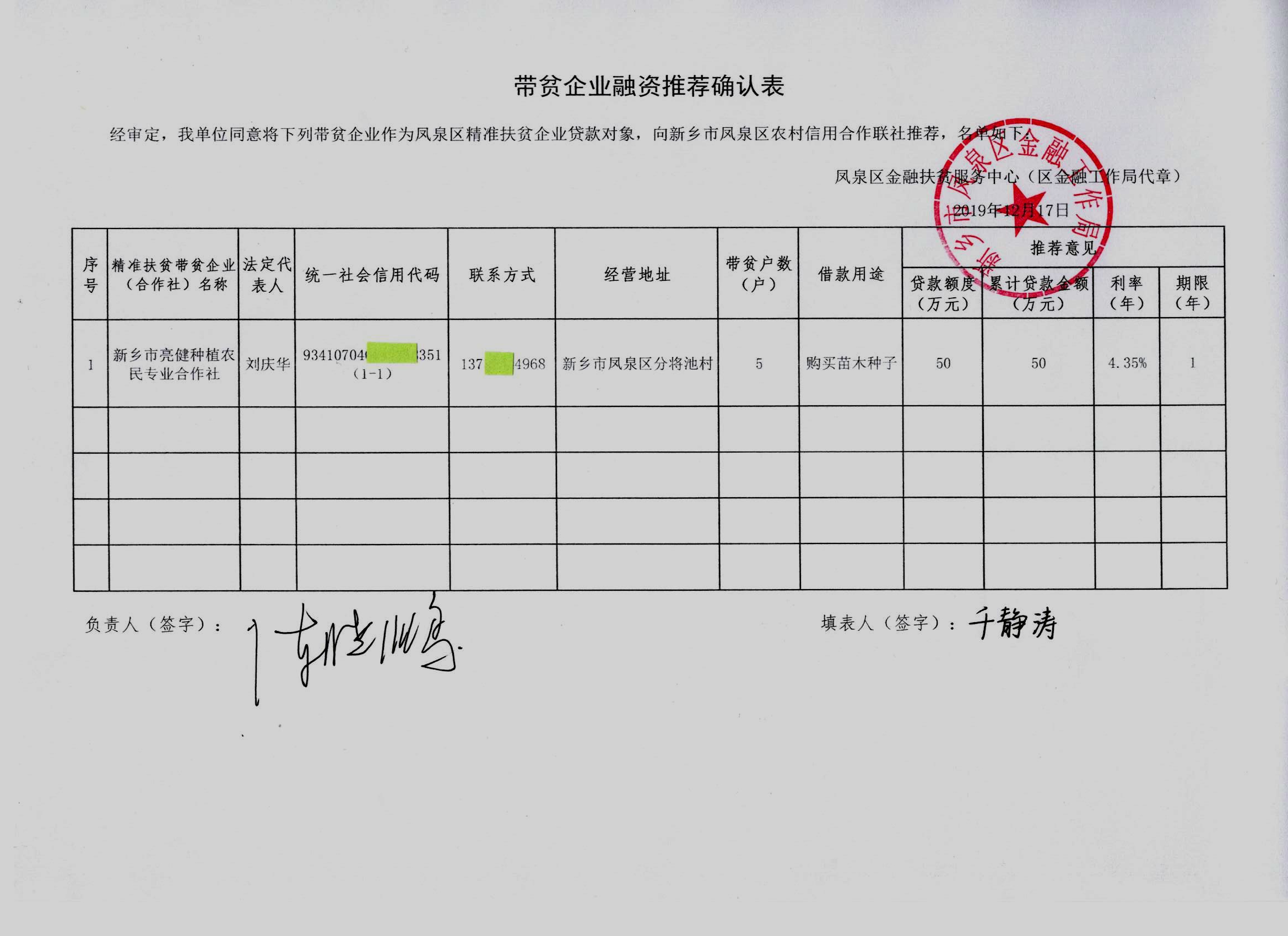 2019年12月17日凤泉区金融扶贫服务中心向区信用联社推荐一家精准扶贫带贫企业:新乡市亮健种植农民专业合作社。