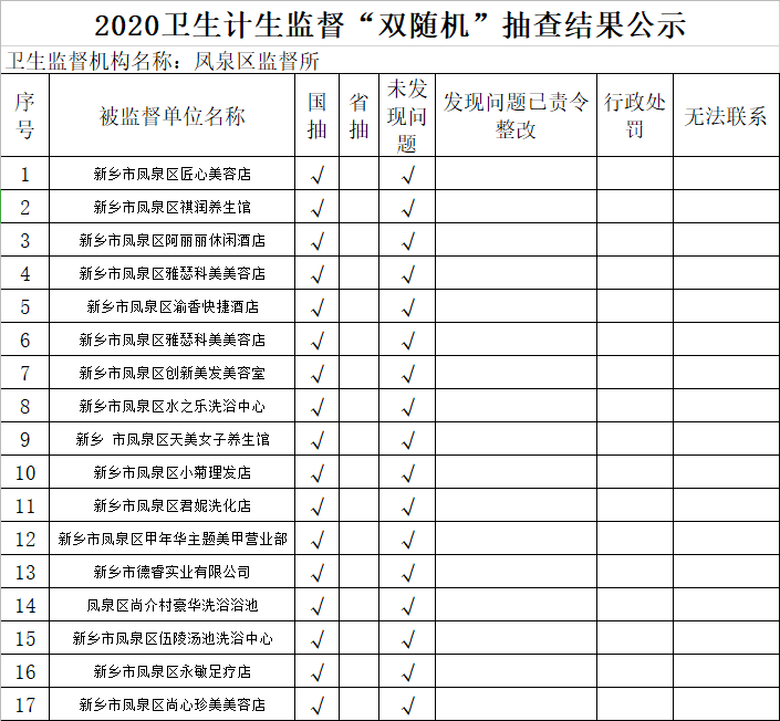 凤泉区卫健委2020双随机抽检公开
