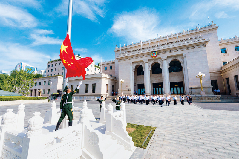 维护党的团结和集中统一,不能停留在口头上,而是要体现在行动上。全国政协机关是服务专门协商机构建设的搭台者,始终注重把维护党的团结和集中统一,体现到增强“四个意识”、坚定“四个自信”、做到“两个维护”上,体现到坚决贯彻落实习近平总书记重要讲话、重要指示批示精神和党中央决策部署的具体行动上,为专门协商机构发挥在国家治理体系中的重要作用更好服务。图为2020年7月1日,全国政协机关在中共八大会址(全国政协礼堂)前举行升国旗仪式。 人民政协网记者 贾宁/摄