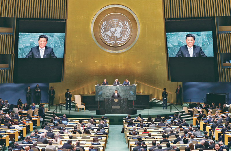 2015年9月28日,习近平总书记出席第70届联合国大会一般性辩论并发表重要讲话,郑重提出“和平、发展、公平、正义、民主、自由,是全人类的共同价值”。 新华社记者 庞兴雷/摄