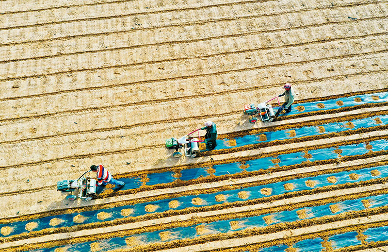 一年之计在于春。做好春耕备耕工作,事关粮食安全大局。图为2022年3月11日,在甘肃省张掖市临泽县平川镇一工程村6500多亩制种玉米地里,农户们正忙碌着覆膜保墒。 求是图片 王将/摄