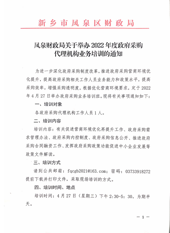 凤泉区财政局关于举办2022年度政府采购代理机构业务培训的通知