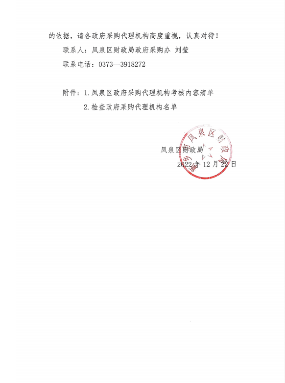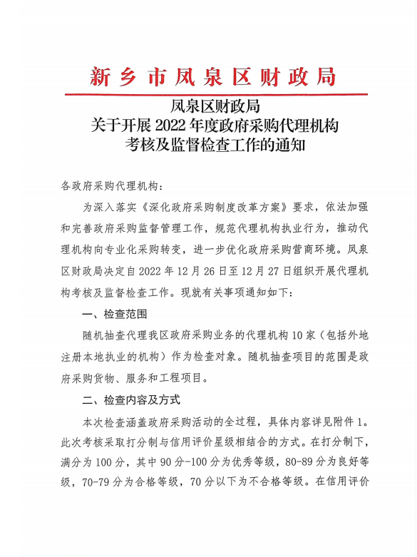 凤泉区财政局关于开展2022年度政府采购代理机构监督检查工作的通知