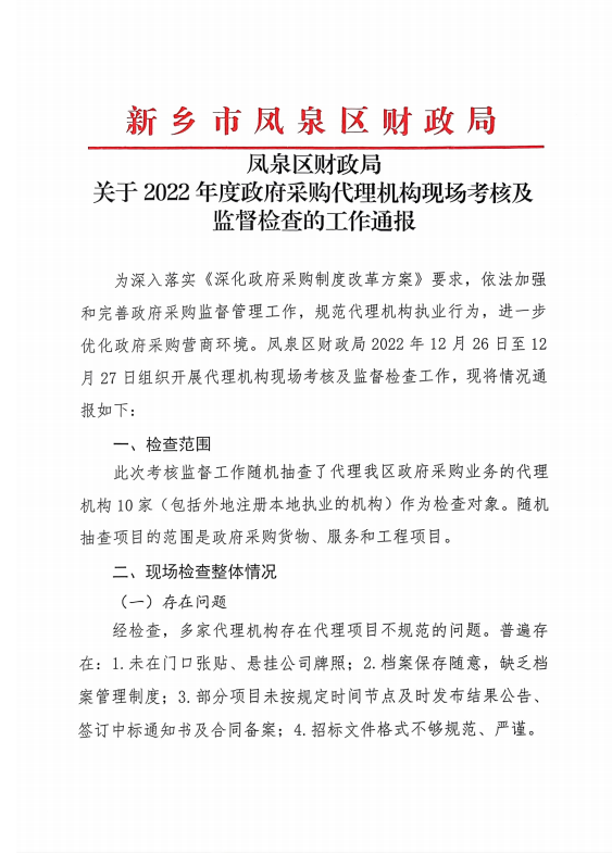 凤泉区财政局关于2022年度政府采购代理机构现场考核及监督检查工作的工作通报