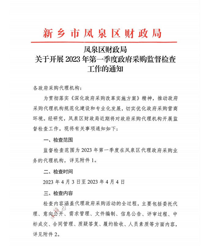 凤泉区财政局关于开展2023年第一季度政府采购监督检查工作的通知