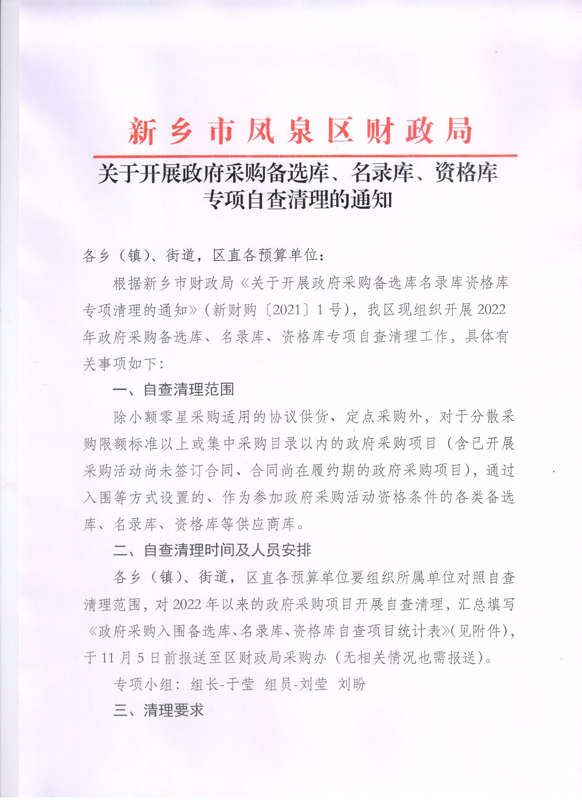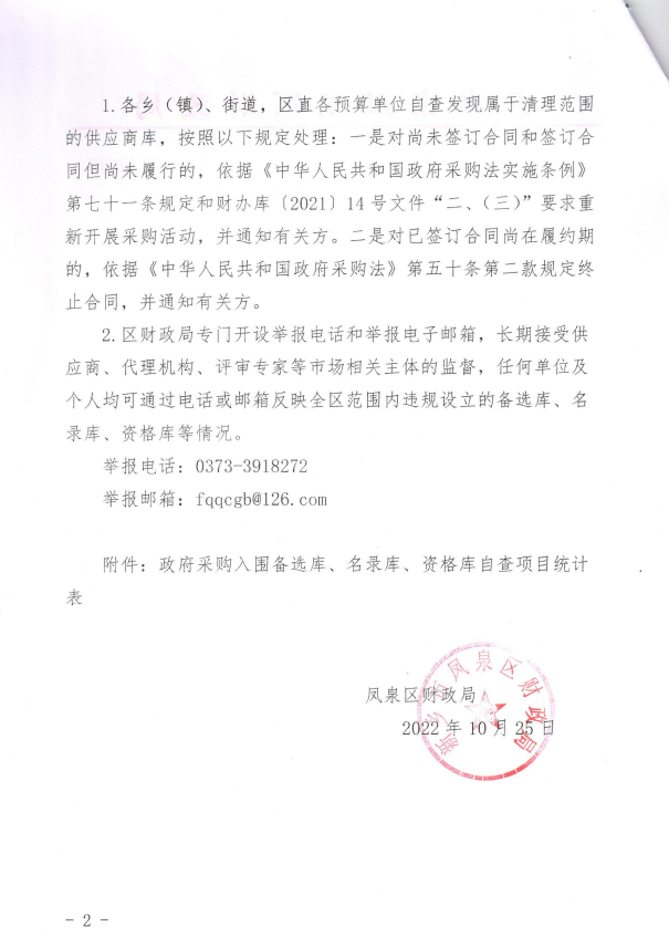 凤泉区财政局关于开展政府采购备选库、名录库、资格库专项自查清理的通知