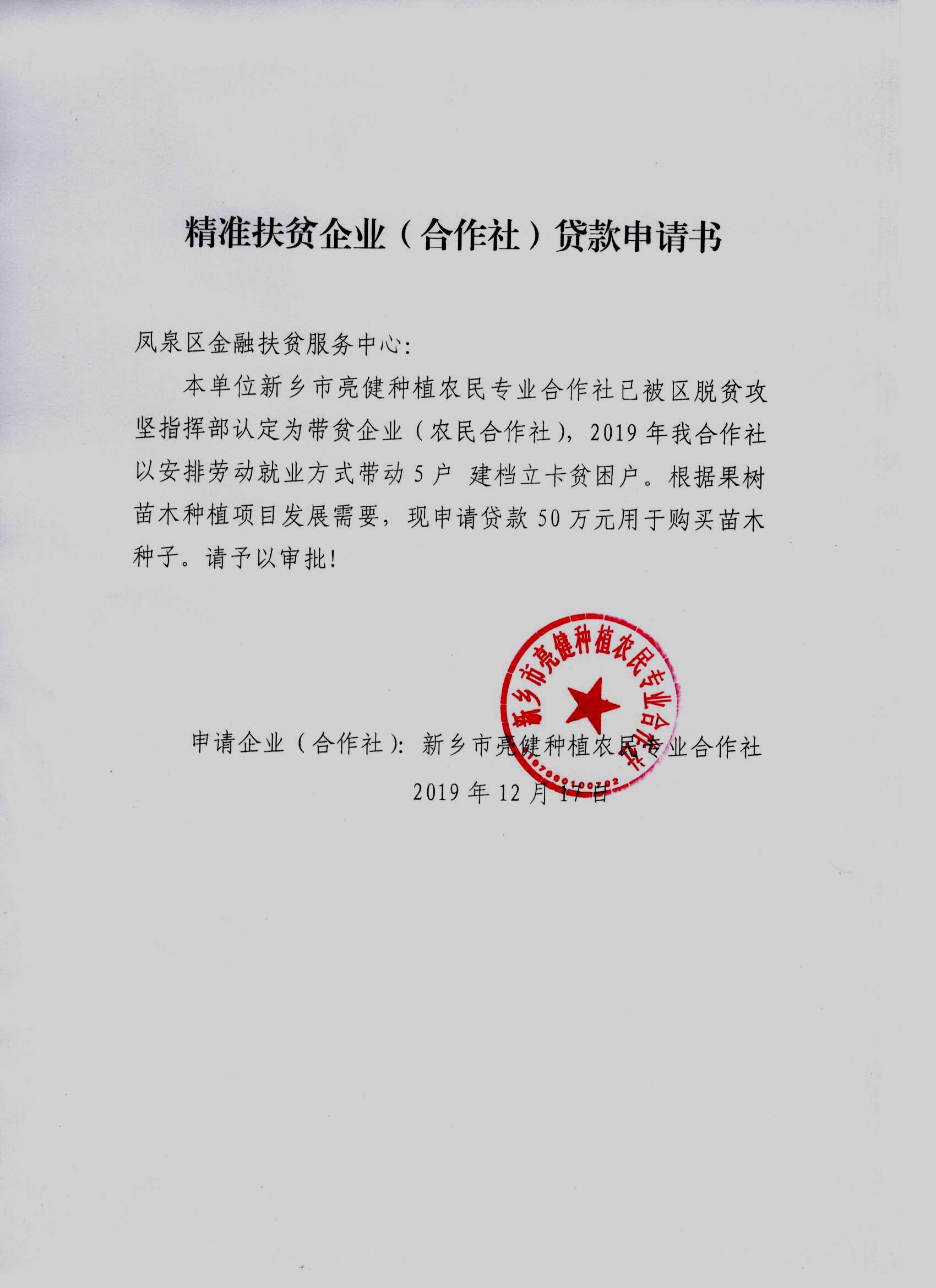 2019年12月17日凤泉区金融扶贫服务中心向区信用联社推荐一家精准扶贫带贫企业:新乡市亮健种植农民专业合作社。